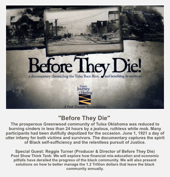 Post Show Think Tank: We will explore how financial mis-education and economic pitfalls have derailed the progress of the black community. We will also present solutions on how to better manage the 1.2 Trillion dollars that leave the black community annually.