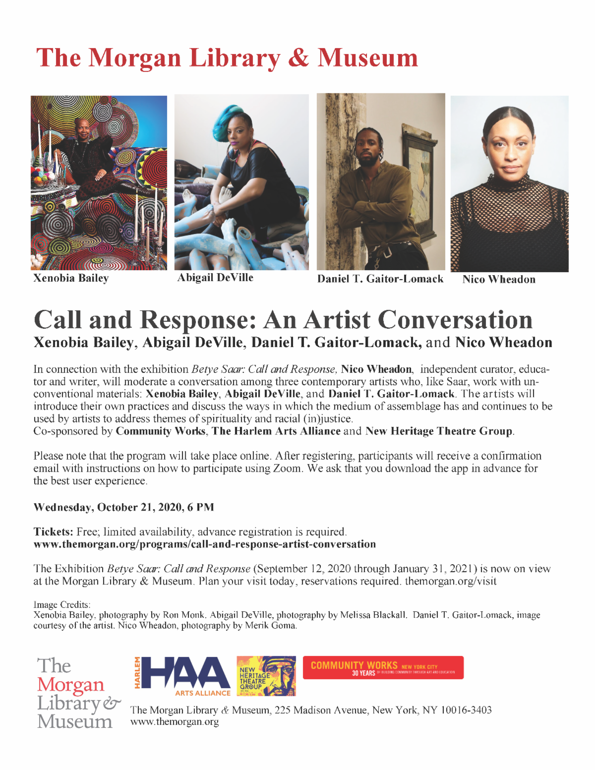 Nico Wheadon, independent curator, educator and writer, will moderate a conversation among three contemporary artists who, like Saar, work with unconventional materials: Xenobia Bailey, Abigail DeVille, and Daniel T. Gaitor-Lomack.