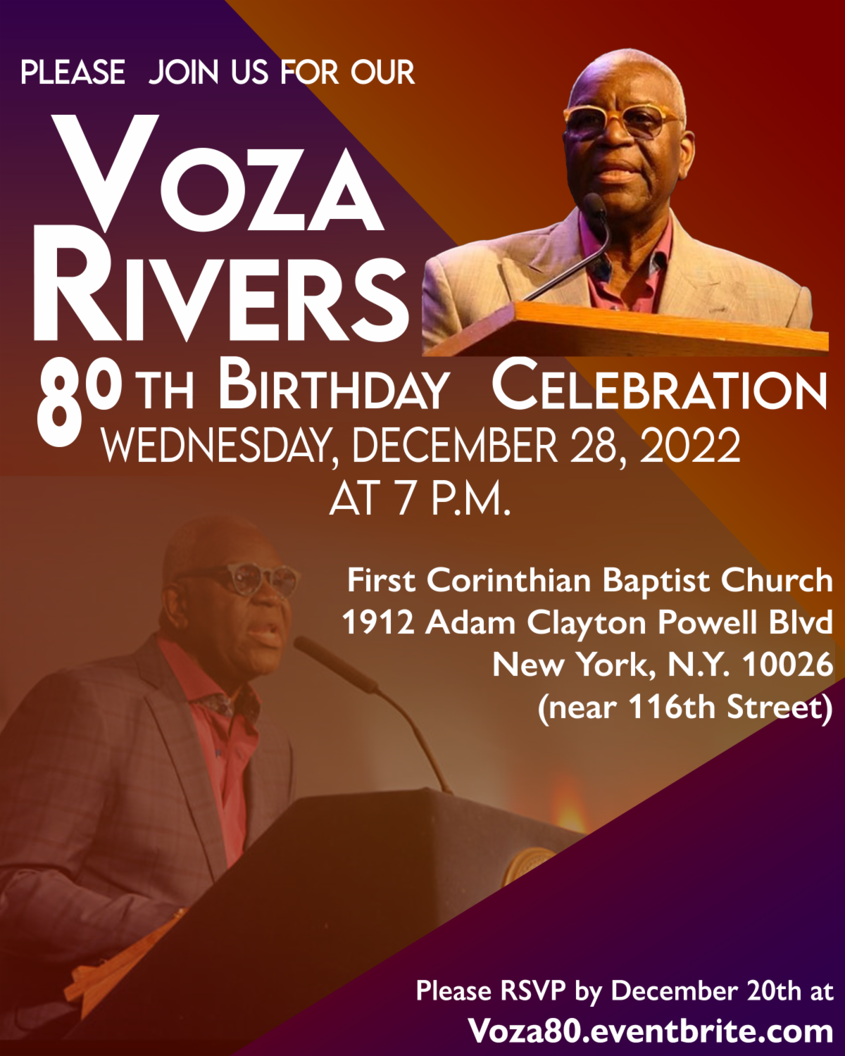 VOZA RIVERS, founding member of Harlem’s New Heritage Repertory Theatre (“NHRT”), (est. 1964), is one of the country’s leading African American theater, music, and events producer, and documentary filmmaker.