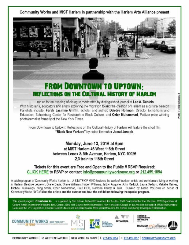 Please join Barbara Horowitz, Community Works. and Harlem Arts Alliance in their presentation with leading voices and conversation moderated by journalist Lee A. Daniels, educator/professor/author Farah Jasmine Griffin, cultural administrator Deirdre Hollman and photo-journalist Ozier Muhammad in a lively discussion From Downtown to Uptown: Reflections on the Cultural History of Harlem.