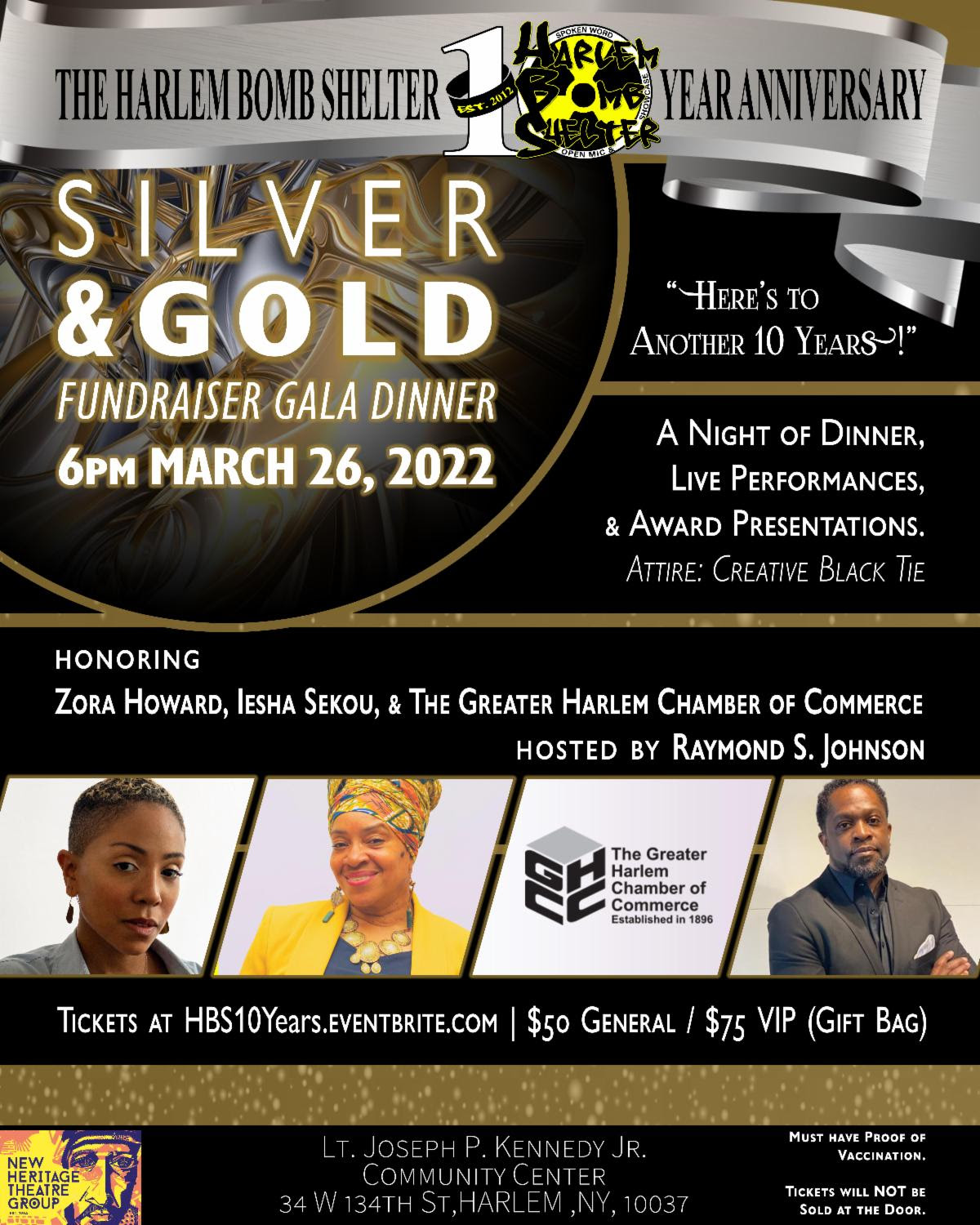 Get your tickets for the Silver & Gold Gala on Saturday, March 26 at 6 PM. Harlem’s own Harlem Bomb Shelter: Open Mic & Showcase, founded by Luther D. Isler and Voza Rivers, invites you to an evening of dinner, arts, and culture as Harlem Bomb Shelter celebrates 10 years of education and empowerment through self-expression and entertainment.