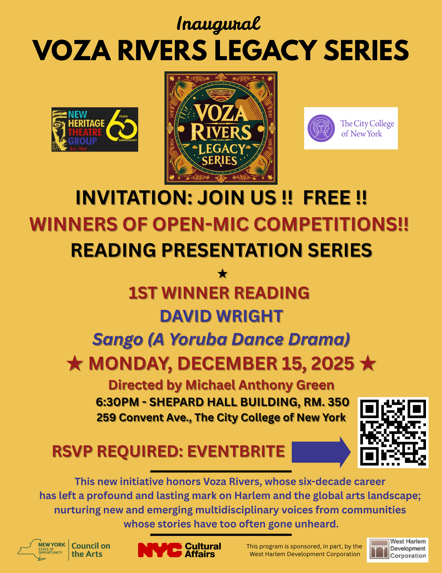 All events are free and open to the public. The RSVP link for December 15, 2025, is: VozaRiversLegacyEvent12-15-25. This reading presentation will take place at CCNY, Shepard Hall, Rm. 350, 229 Convent Avenue at 6:30pm. Audiences will include multi-award-winning producers, venue representatives, agents and actors.